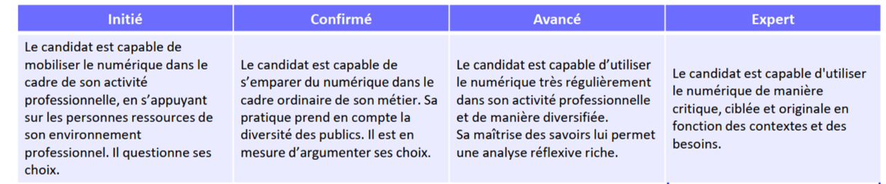 - Un volet dit de « pratique professionnelle » qui permet d’évaluer les pratiques professionnelles du numérique et les capacités réflexives des candidats à travers un dossier et un oral devant un jury.
