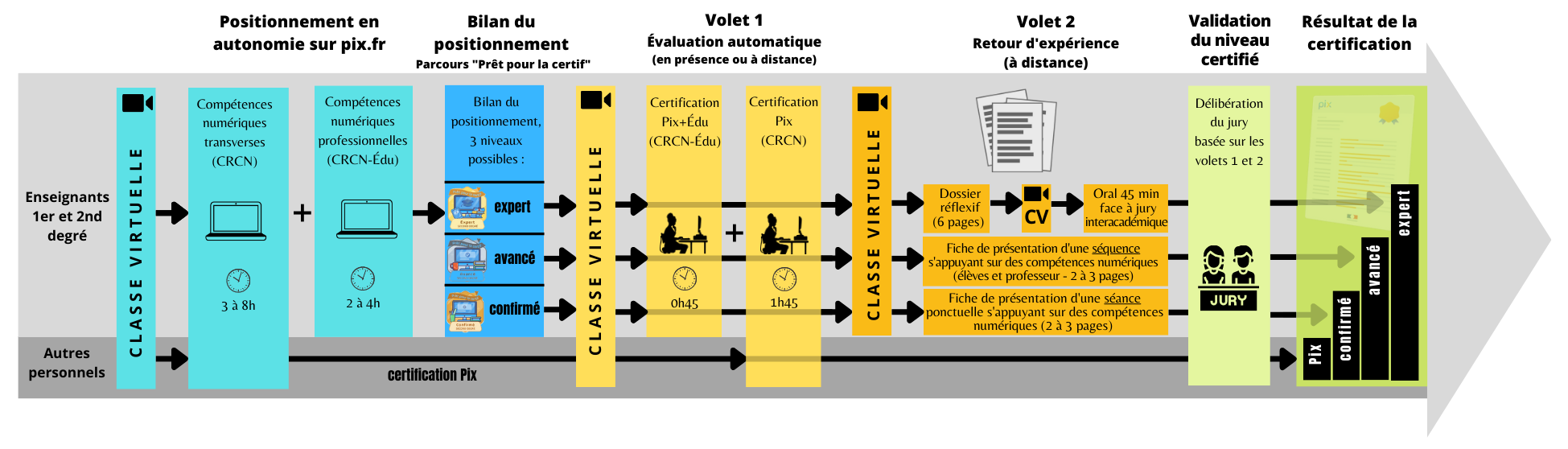 Pour les enseignants qui envisagent un niveau avancé ou expert, un score certifié de 512 Pix constitue le critère d’éligibilité à la certification complémentaire Pix+ Édu qui est composé de deux volets :