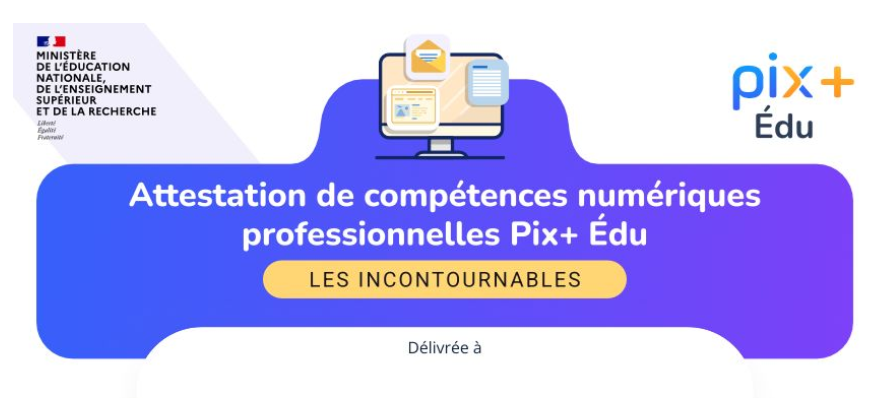 Depuis la rentrée 2025, le dispositif Pix+Édu permet d’obtenir des attestions pour chacune des compétences numériques professionnelles. Les candidats ayant réussi à 50% des parcours thématiques disponibles au niveau national, se voient délivrer une attestation de participation intitulées « Les incontournables ».