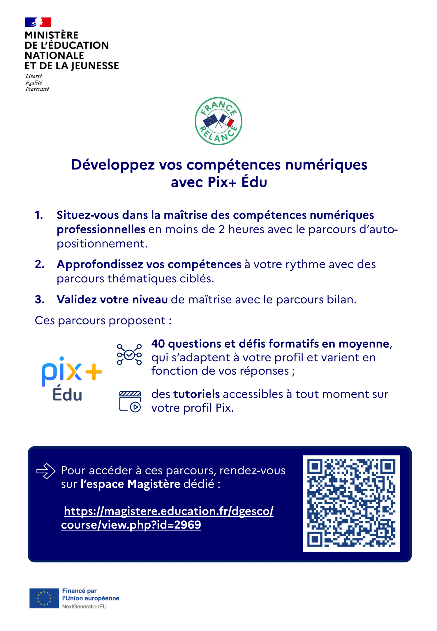 « L’auto-formation sur PIX+ Édu n’est pas évidente et le découragement vous guette ? Vous voudriez avoir davantage d’informations sur le dispositif et les possibilités qu’il offre ? N’hésitez pas à rejoindre le parcours Magistère régional/ Vous y trouverez toutes les informations utiles sur et pendant la certification PIX+Édu, ainsi que des espaces d’échanges en fonction des étapes de sa préparation. Par ailleurs, je reste disponible pour tout renseignement complémentaire »