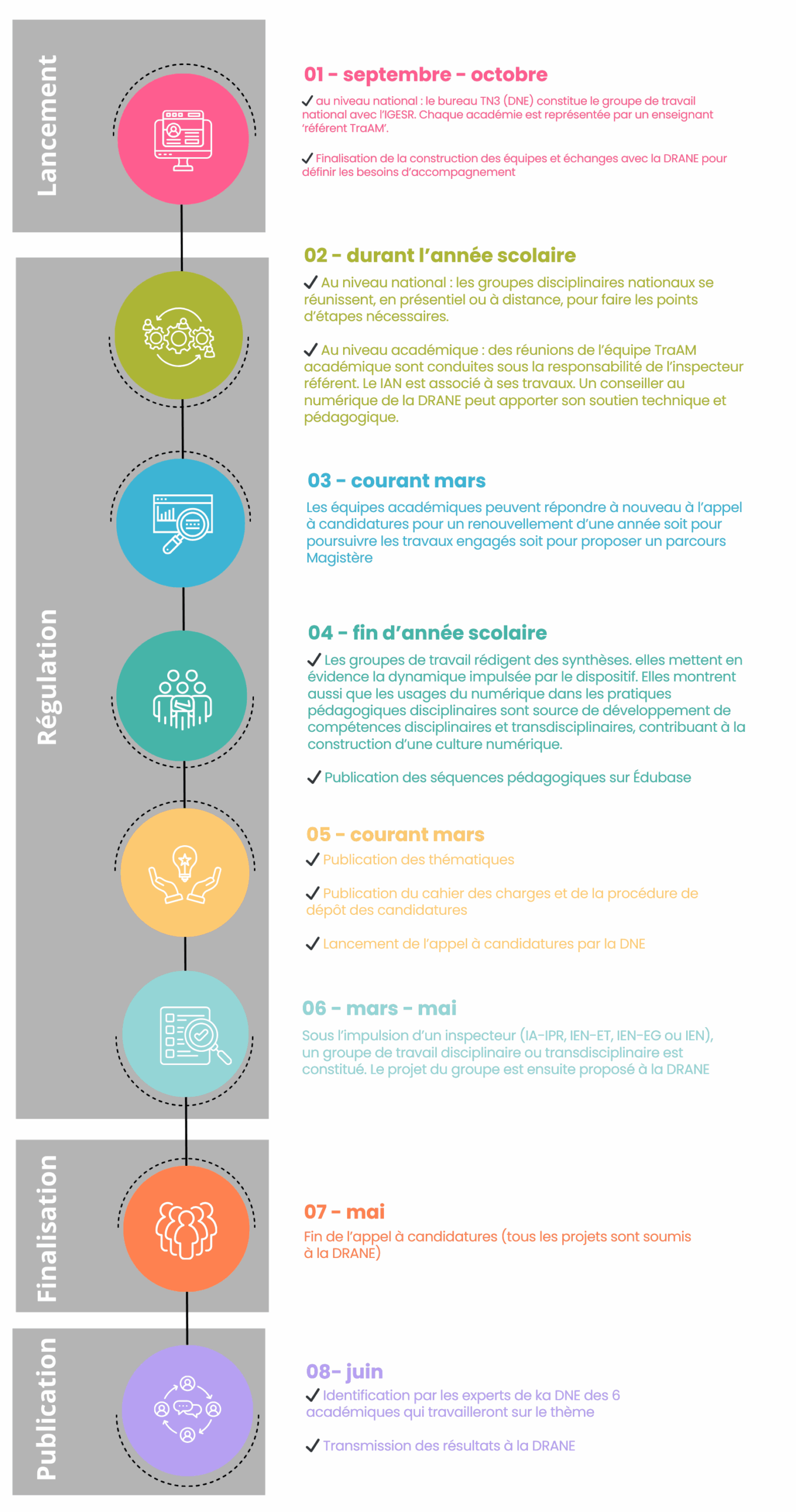 Le travail des groupes TraAM repose sur une démarche collaborative (veille partagée, co-construction de scénarios, de modules de formation, échanges de pratiques, retours et analyse des mises en œuvre sur le terrain).