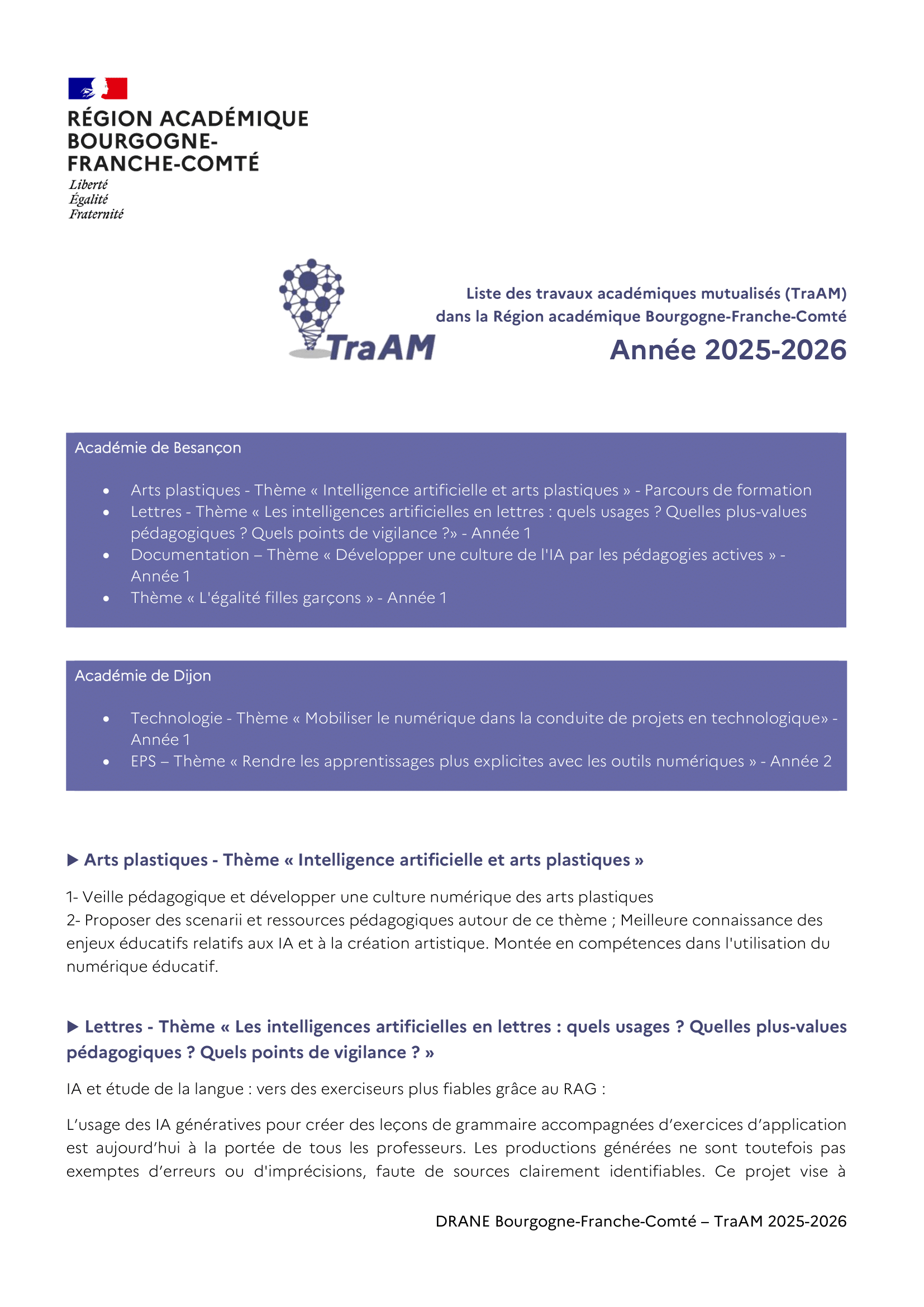 Les travaux académiques mutualisés (TraAM) sont mis en œuvre pour permettre de développer les usages pédagogiques du numérique, d’expérimenter des séquences pédagogiques innovantes en académie et de favoriser la rencontre entre les académies autour de thèmes émergents du numérique éducatif.
