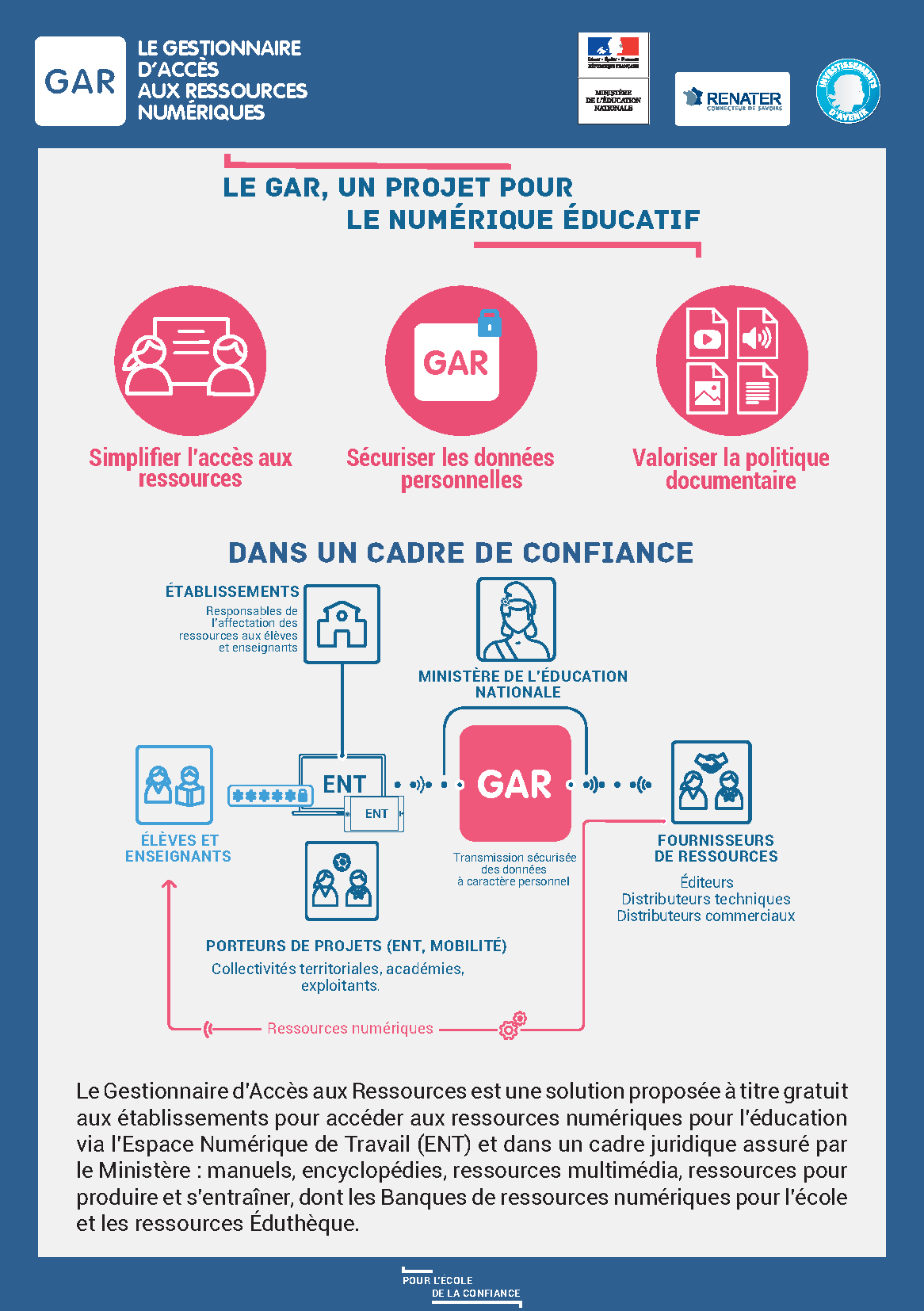 Le GAR permet la gestion simplifiée et centralisée des ressources et manuels numériques (connexion avec son compte ENT sans avoir à se ré-authentifier pour chaque ressource). L’accès aux ressources numériques se déroule dans un cadre de confiance entre les distributeurs commerciaux et techniques d’un côté, et les usagers des écoles et établissements scolaires de l’autre.
