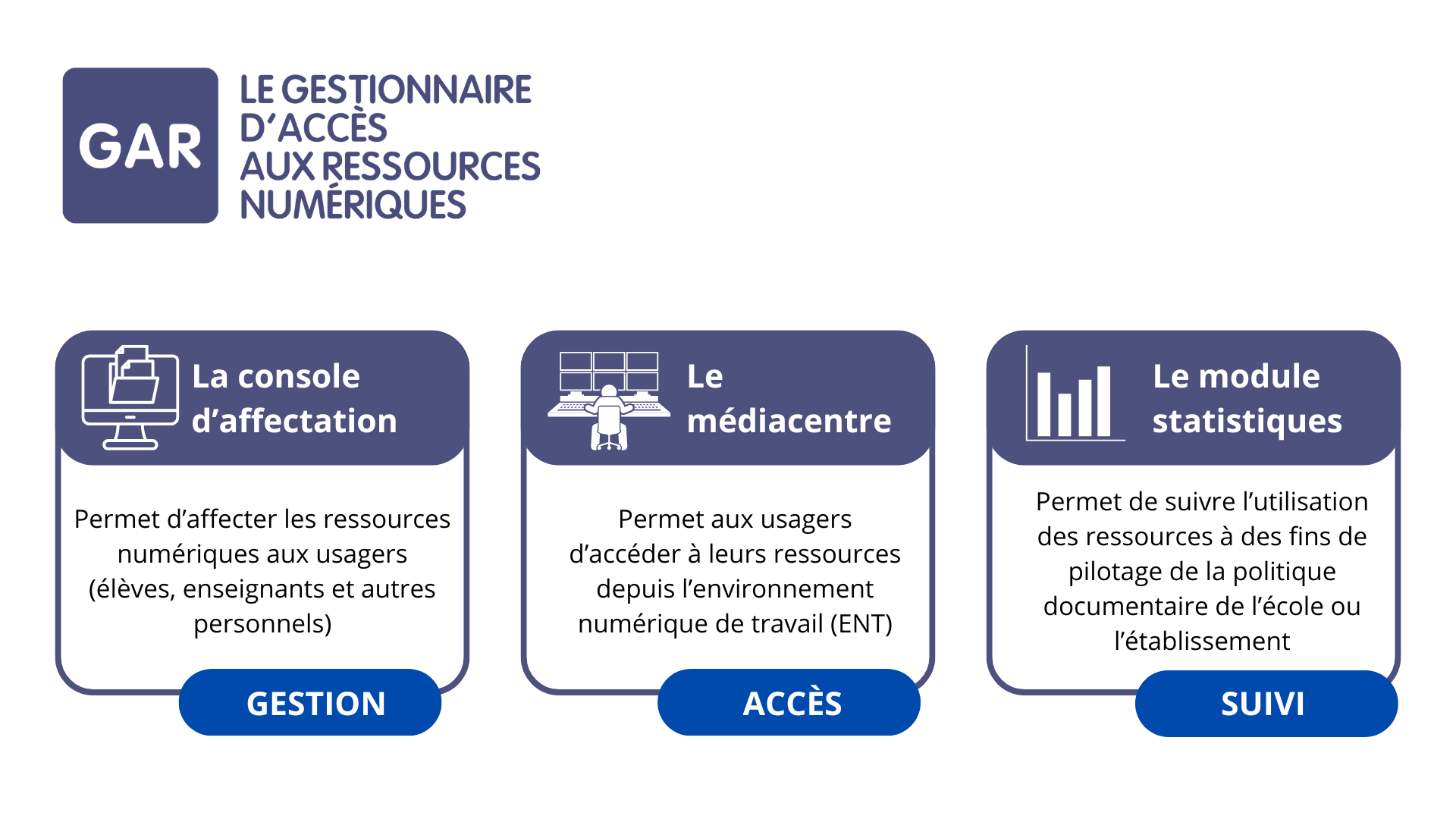 – le GAR permet de gérer les ressources numériques de l’école ou de l’établissement, par profil ou identité.