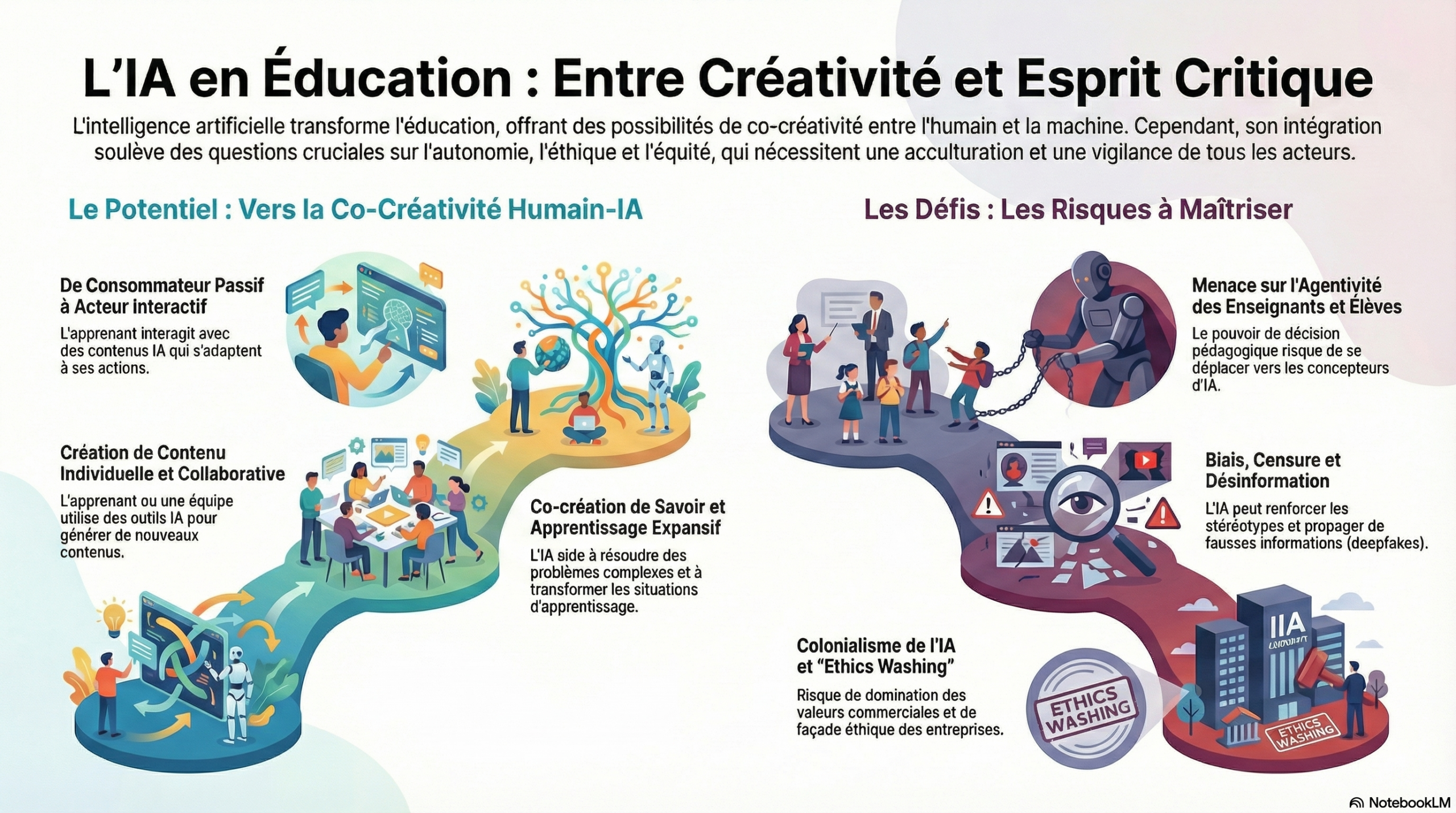 « Alors que l’IA a historiquement cherché à « imiter » l’intelligence humaine (paradigme de la simulation), les auteurs proposent une transition vers l’intelligence hybride et la co-créativité humain-IA . Le postulat central est que l’IA ne doit pas simplement automatiser des tâches mais servir d’appui pour la créativité et l’agentivité (capacité d’agir) des apprenants.» (Applications créatives de l’intelligence artificielle en éducation, par Urmeneta et Romero, Carnet Hypothèses 2024)