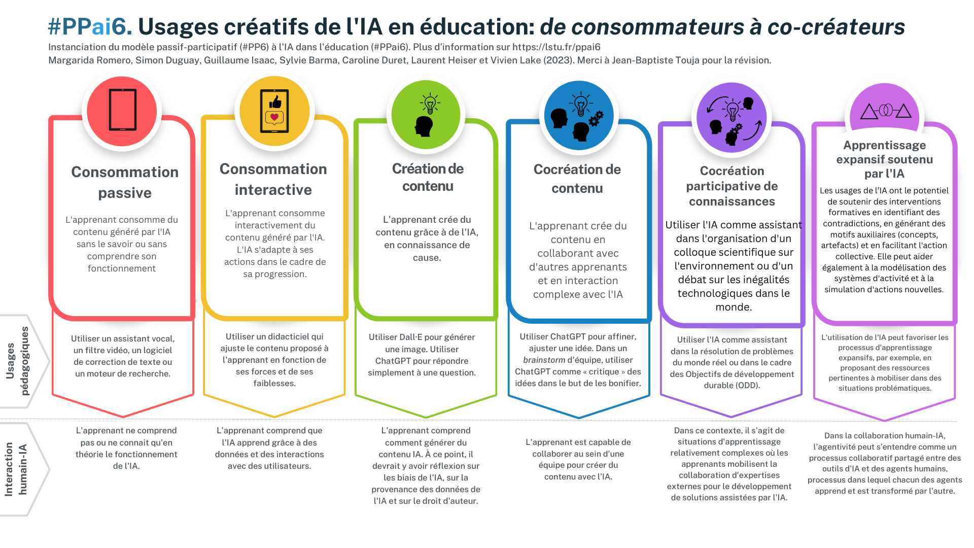 Le digital a révolutionné hier l’éducation en facilitant la création d’environnements d’apprentissage interactifs et l’IA consolide aujourd’hui ces évolutions. Elle s’avère déterminante pour booster l’engagement des élèves mais aussi la formation professionnelle. À titre d’illustration, le modèle Participatif-Passif (PP) pour l’IA dans l’éducation (#PPai6) distingue six niveaux d’engagement créatif :