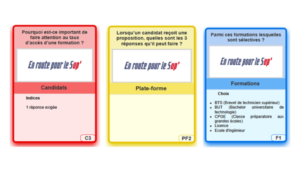 Ce jeu sérieux en ligne co-développé par la DRAIO et la DRANE. Il est constitué de cartes physiques de type questions-réponses. Le scénario du jeu : en tant qu’expert Parcoursup, les élèves vont devoir aider Célia, une élève de Terminale STL, à prépare ses vœux sur la plateforme Parcoursup. Le challenge : ils sont plusieurs experts sur le coup, il s’agit donc que chacun se démarque en lui fournissant les meilleurs conseils.Il y a 3 grandes catégories de questions. À terme, le jeu proposera différents profils d’élèves à conseiller.