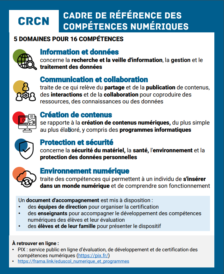 Le cadre de référence des compétences numériques (CRCN) définit ce que signifie « être compétent numériquement » pour un élève au sein du système éducatif. Il décrit, de manière progressive, les savoirs et savoir‑faire attendus pour rechercher de l’information, produire des contenus, communiquer, protéger ses données ou encore résoudre des problèmes avec le numérique. Il sert ainsi de socle commun pour structurer les apprentissages, du primaire au lycée, en lien avec les programmes et les usages réels des outils numériques.