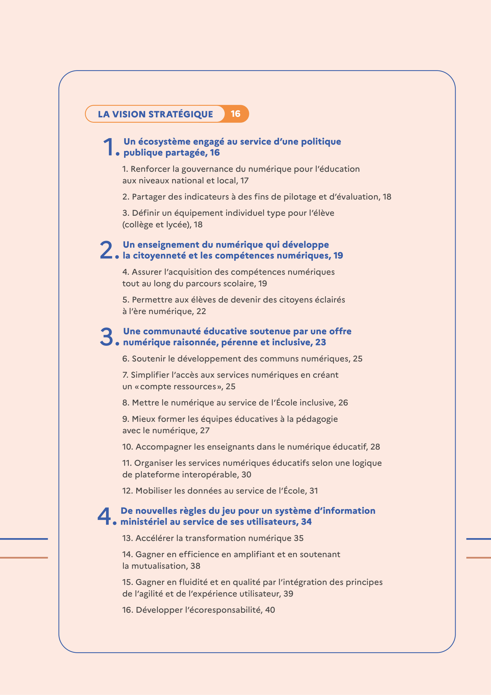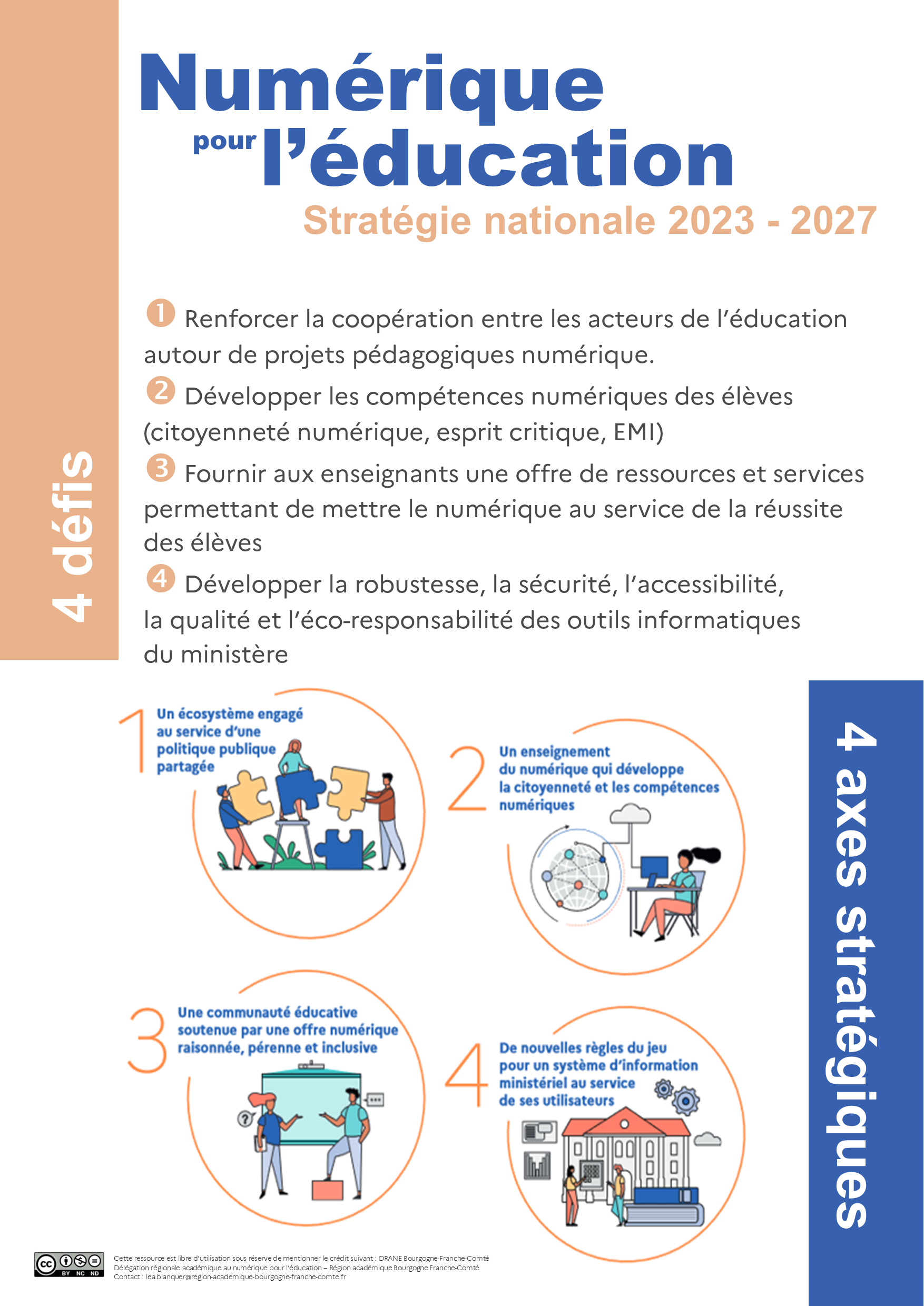 Ce document est une feuille de route qui articule montée en compétences des élèves et des adultes, amélioration des services, gouvernance renforcée, et transformation durable des infrastructures numériques du système éducatif. Il s’articule autour de quatre grands axes, déclinés en 16 objectifs opérationnels.