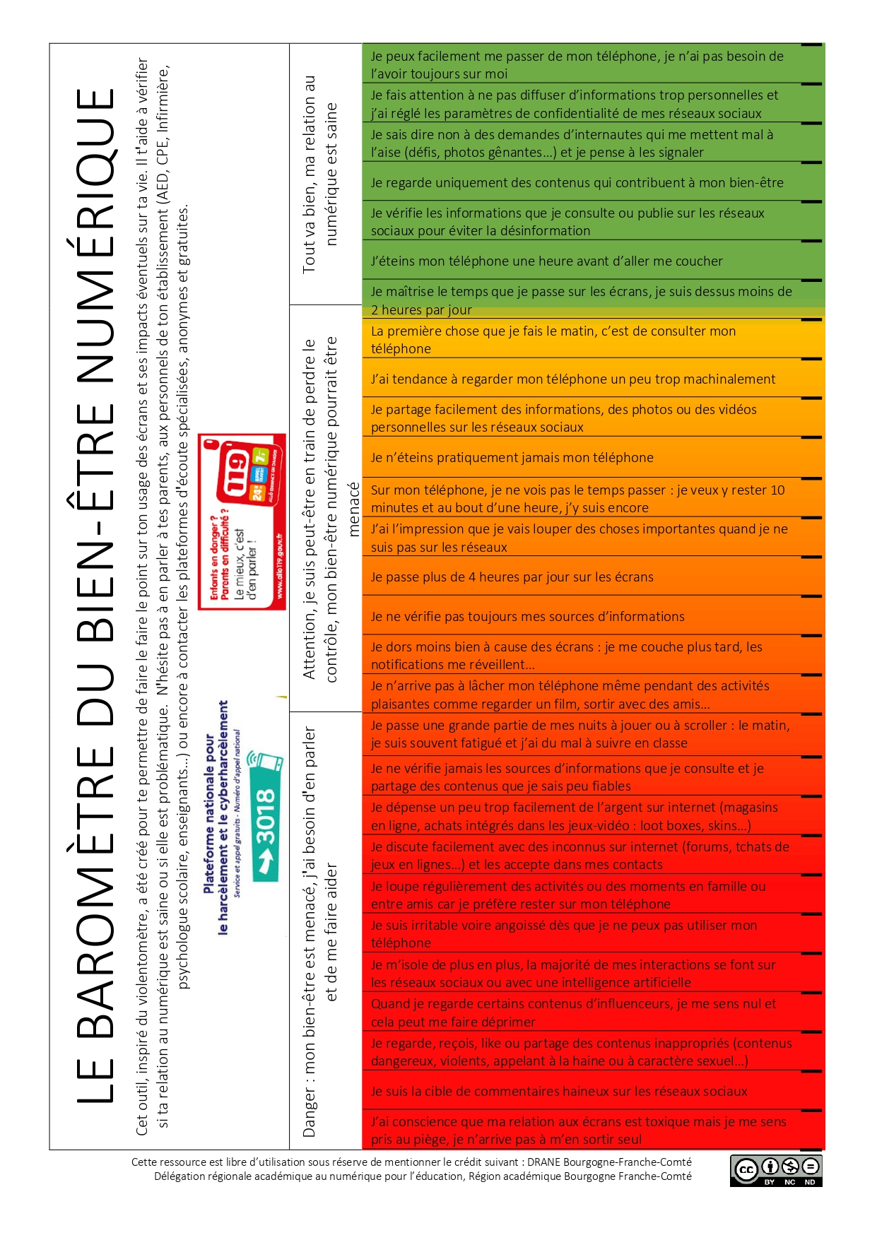 Ce baromètre, conçu par la DRANE Bourgogne-Franche-Comté sur le modèle du violentomètre, est un outil de prévention et de sensibilisation, non scientifique et entièrement déconnecté. Il offre aux collégiens des repères clairs et progressifs et permet d’identifier les éventuels impacts du numérique sur leur quotidien.